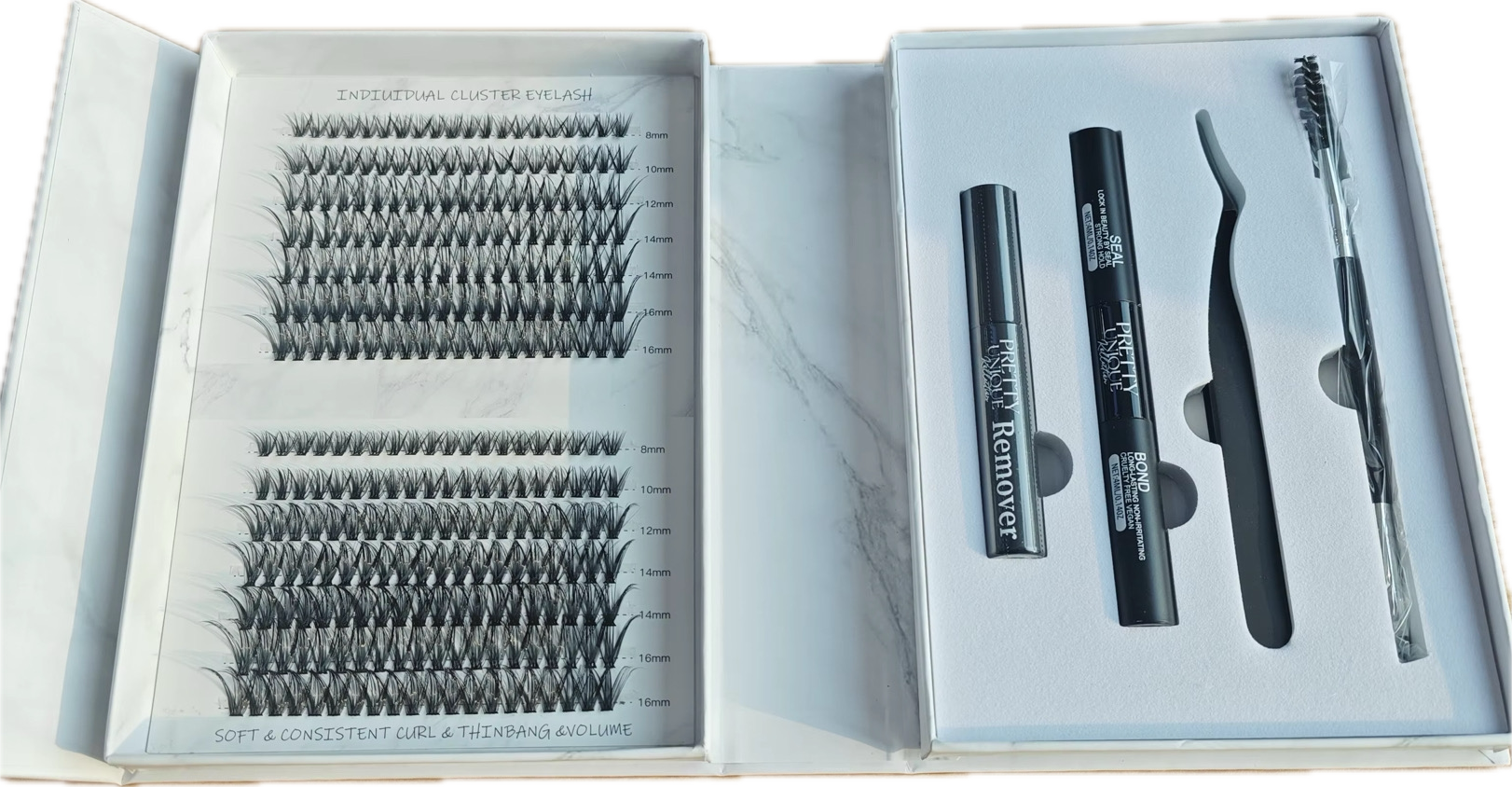 Our DIY lash extension kits provide a convenient and cost-effective way to achieve a customized, long-lasting look. Simply apply the false eyelashes with bonding glue and seal for perfect lashes every morning. Handmade for a tailored, unique appearance, these extensions eliminate the need for professional services and create your own look with our DIY Lash Extensions